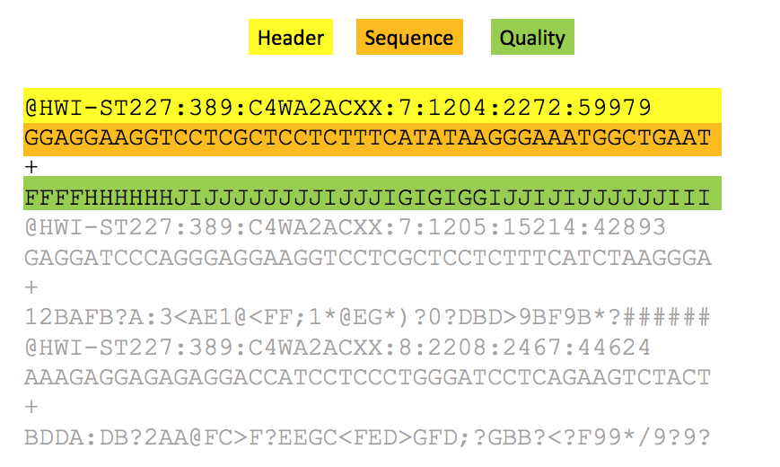 This format contains the information about the sequence and the quality of each sequenced base. The quality encodes the probability that the corresponding base call is incorrect.