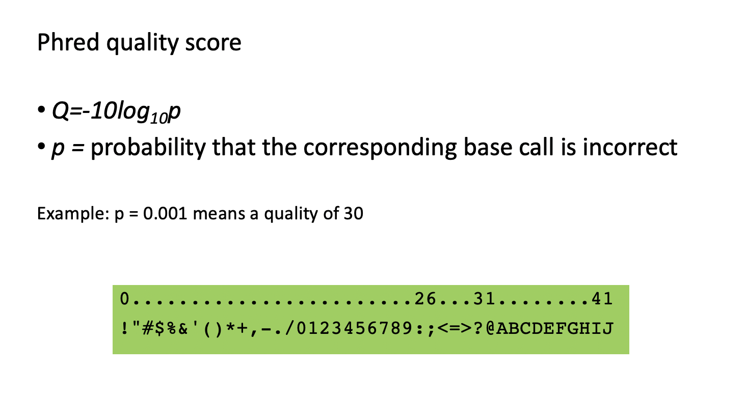 Score = 30 (symbol ‘?’) => probability of incorrect base call = 0.001 => base call accuracy = 99.9% - This is a commonly acceptable threshold for trimming reads for low-scored ends or average score of the read.