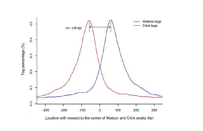 Since ChIP-DNA fragments are equally likely to be sequenced from both 5’ and 3’ ends, the read density around a true binding site should show two peaks, one at the 5’ and one at 3’. MACS takes advantage of this bimodal pattern to empirically model the fragment size d and shifts all reads d/2 toward the 3’ ends.