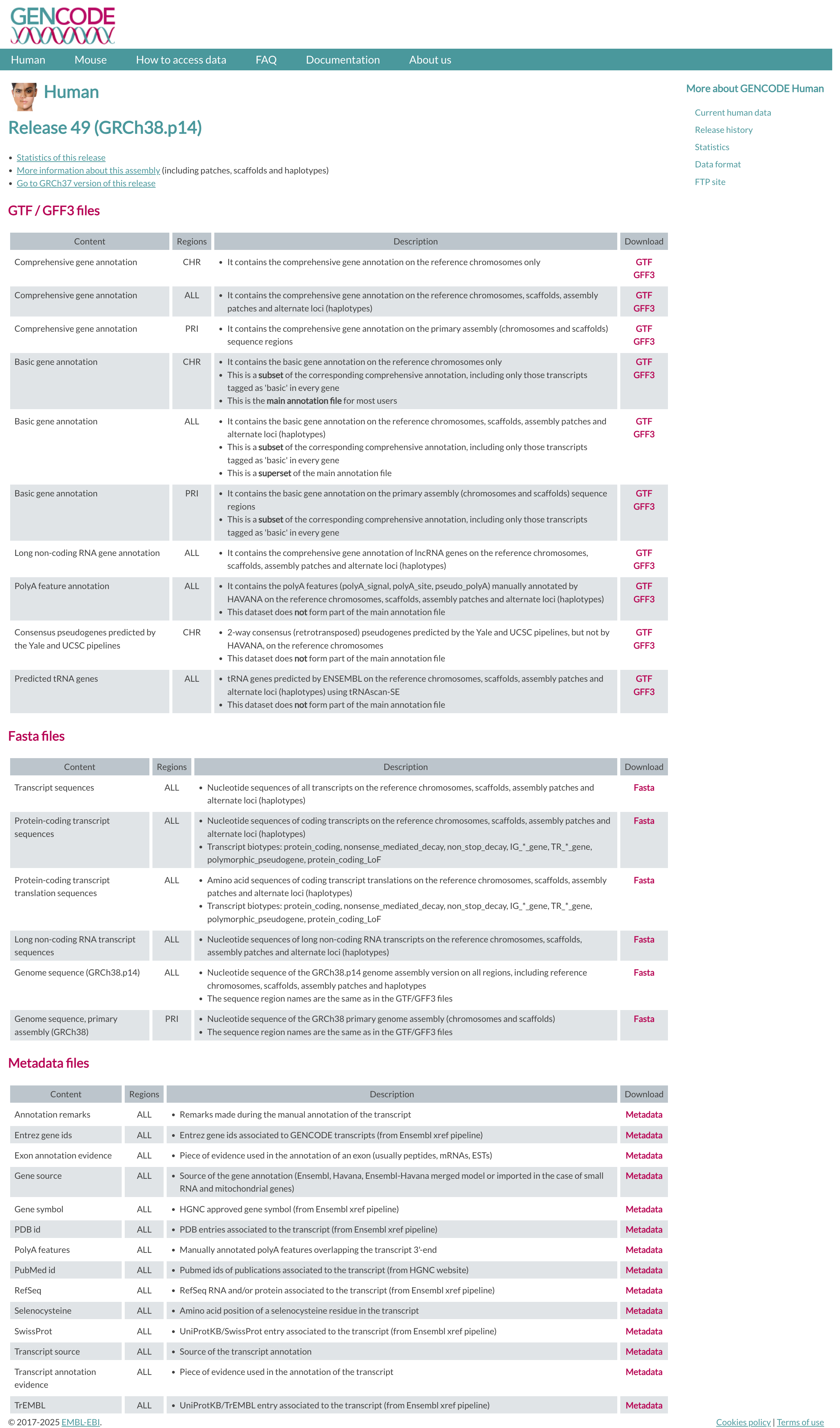 GENCODE contains an accurate annotation of the human and mouse genes derived either using manual curation, computational analysis or targeted experimental approaches. GENCODE also contains information on functional elements, such as protein-coding loci with alternative splicing variants, non-coding loci, and pseudogenes.